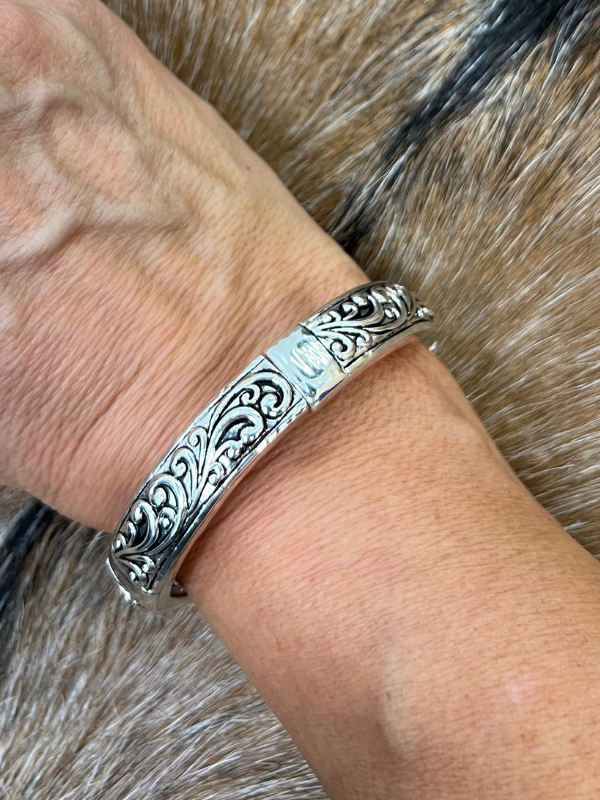 Beaded Ring, Gold Scrolling, Smooth Silver Stretch Bracelet